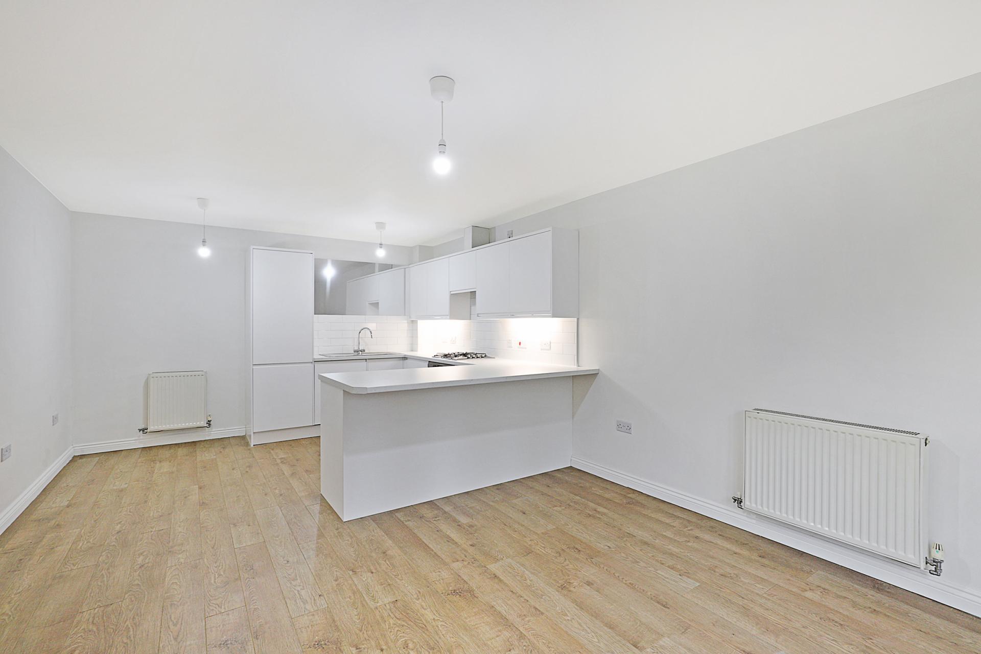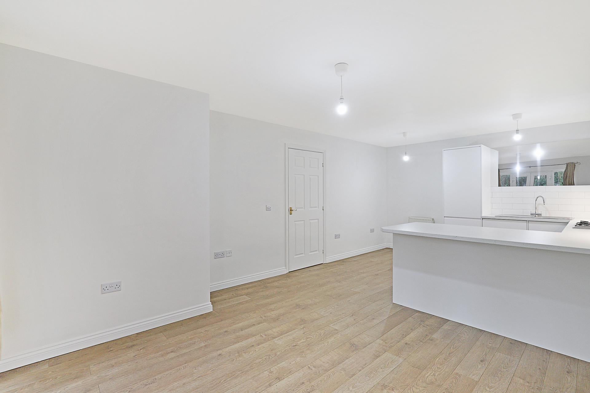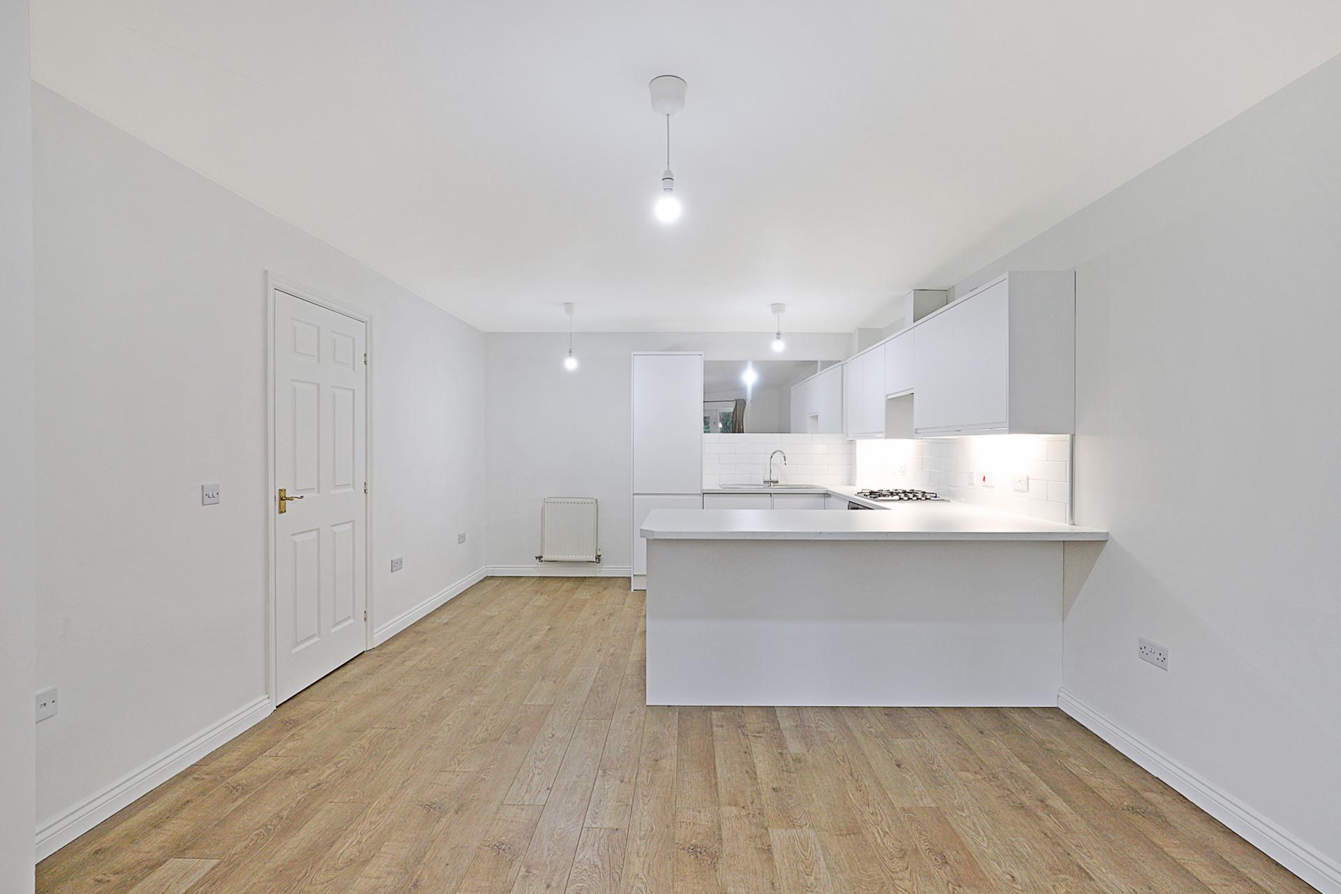 OPEN PLAN KITCHEN / LIVING / DINING SPACE 21' 1" x 12' 8" max. (6.43m x 3.86m) Oak-style laminated flooring throughout. French doors opening to the private front garden. New kitchen installation in stunning white, incorporating a range of storage units and integrated appliances, including gas hob with extractor above and electric oven below, vertical fridge/freezer, dishwasher and washing machine.