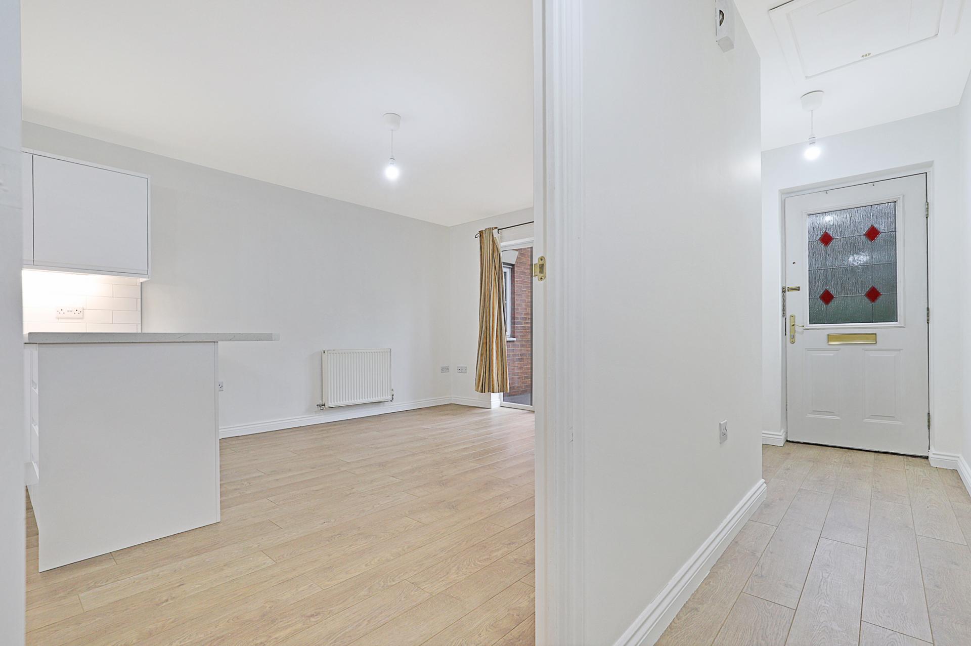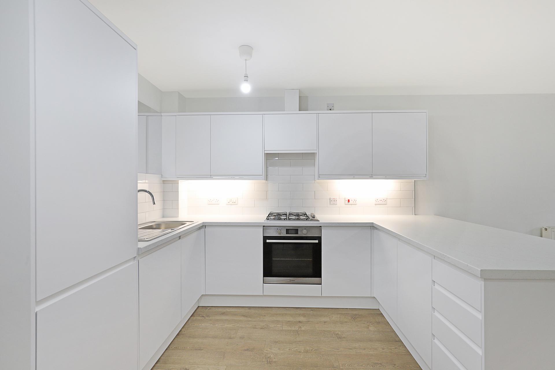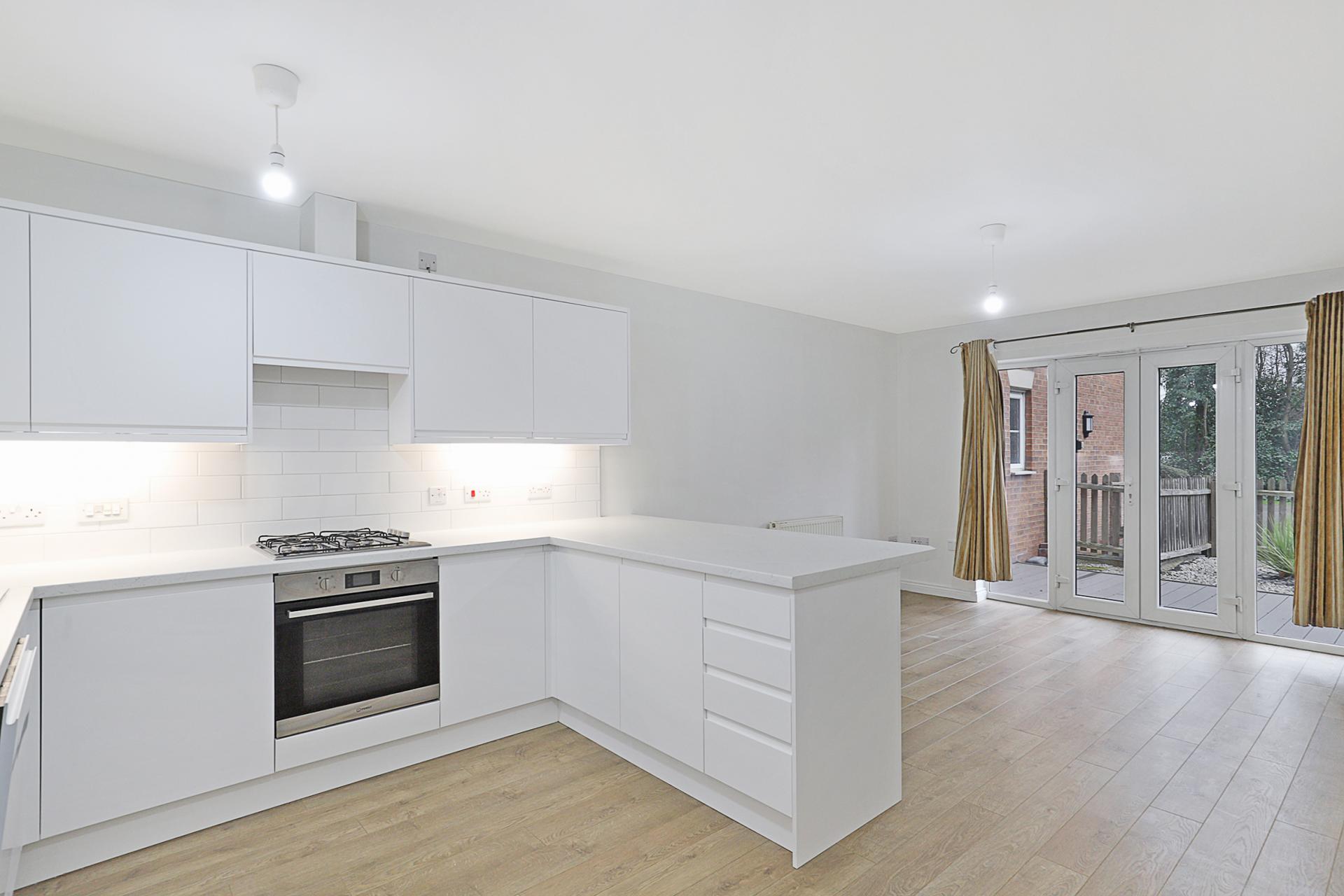 OPEN PLAN KITCHEN / LIVING / DINING SPACE 21' 1" x 12' 8" max. (6.43m x 3.86m) Oak-style laminated flooring throughout. French doors opening to the private front garden. New kitchen installation in stunning white, incorporating a range of storage units and integrated appliances, including gas hob with extractor above and electric oven below, vertical fridge/freezer, dishwasher and washing machine.