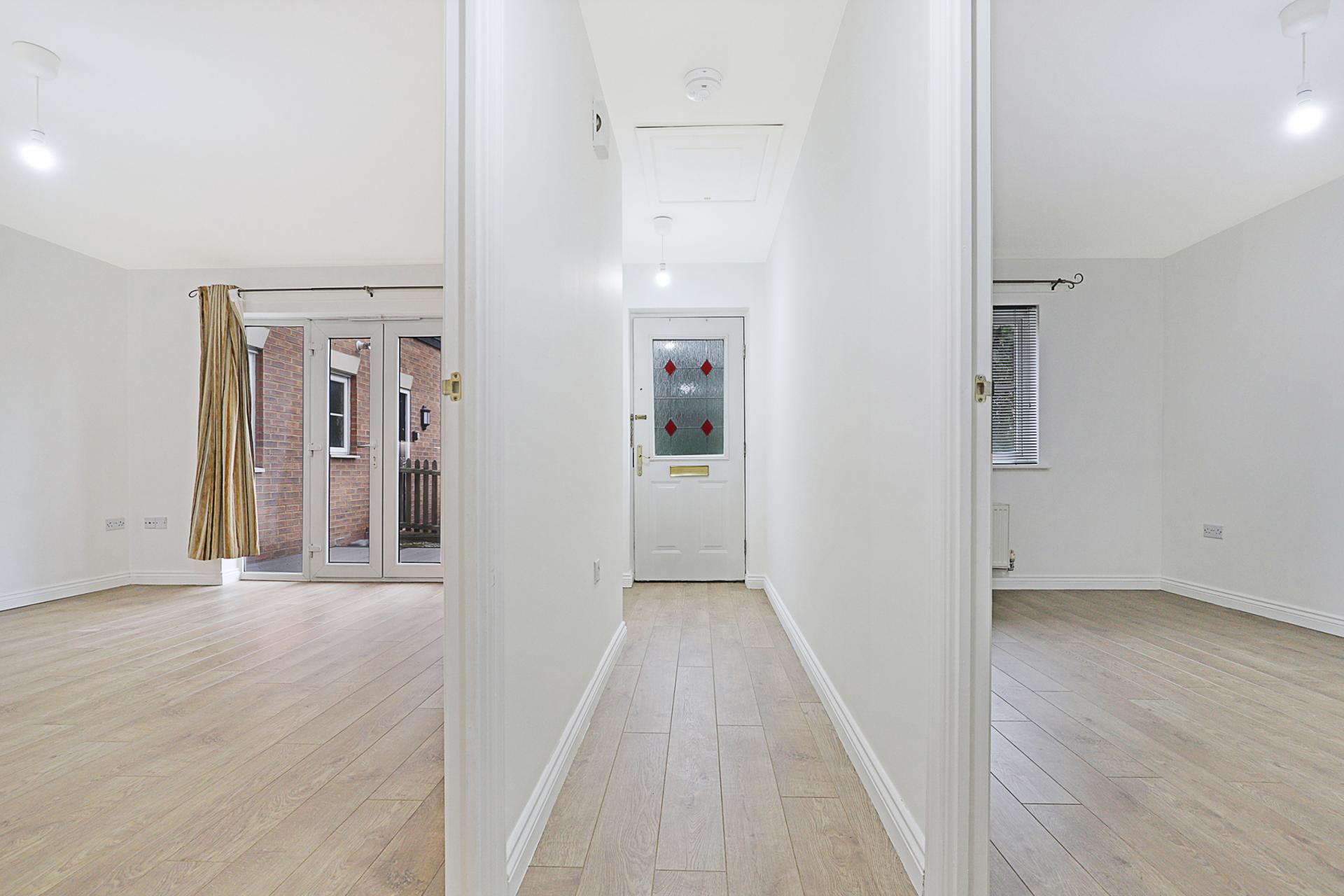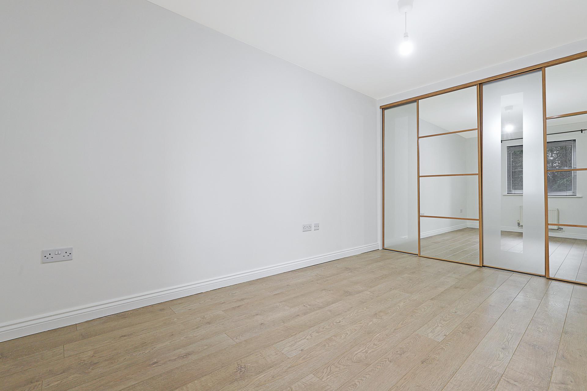DOUBLE BEDROOM 16' 0" x 9' 0" (4.88m x 2.74m) Oak-style laminated flooring, Widow to front elevation with view over the private front garden. Built-in storage space with mirror-fronted, sliding wardrobe doors.