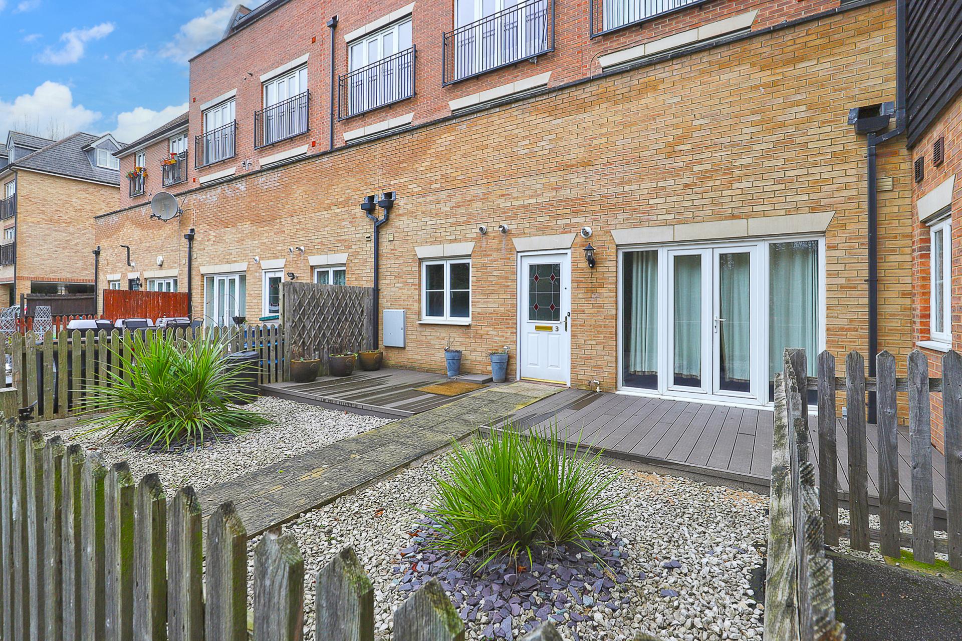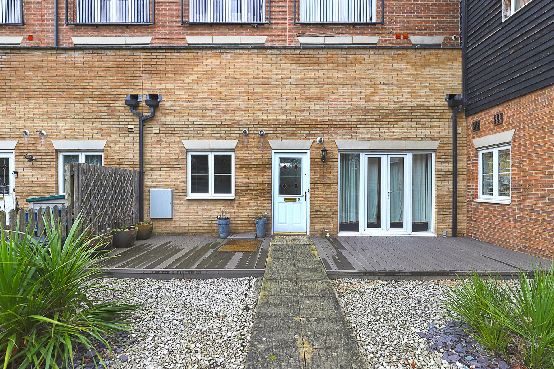 PRIVATE FRONT GARDEN 26' 0" x 19' 6" (7.92m x 5.94m) Enclosed by wooden picket fencing with centre gate opening to paved pathway leading to the front entrance door. New twin decking areas in a stunning graphite colour composite, providing a super outdoor space to be enjoyed time after time.
