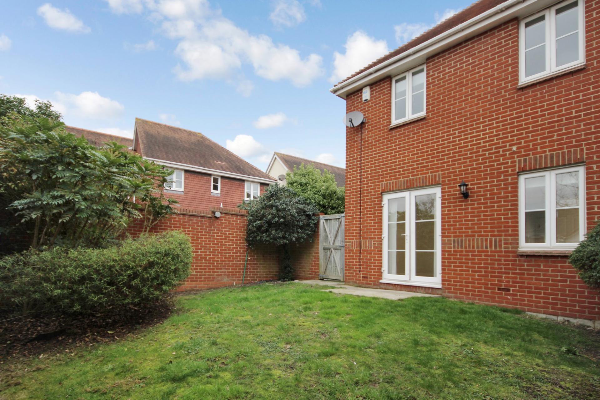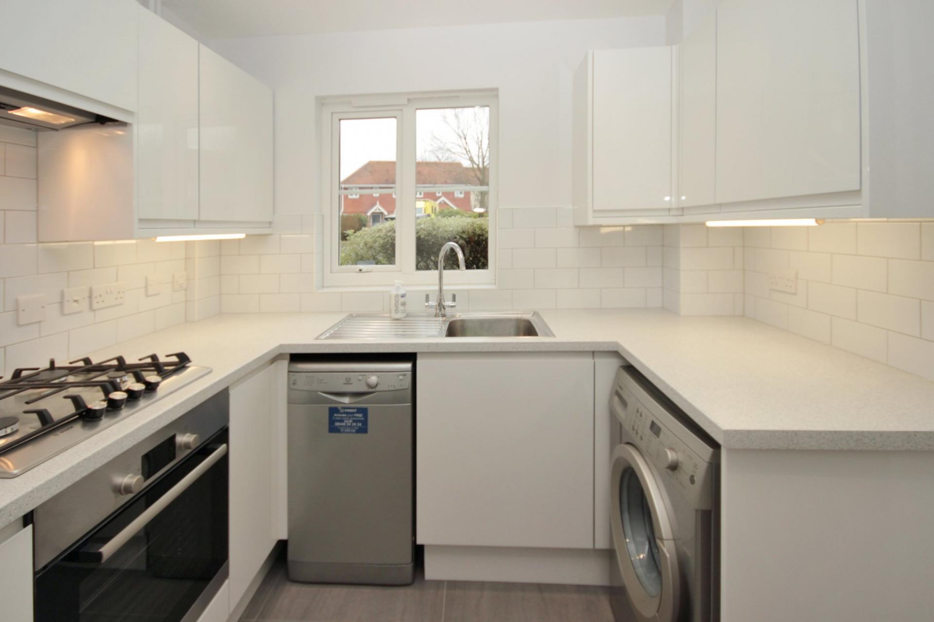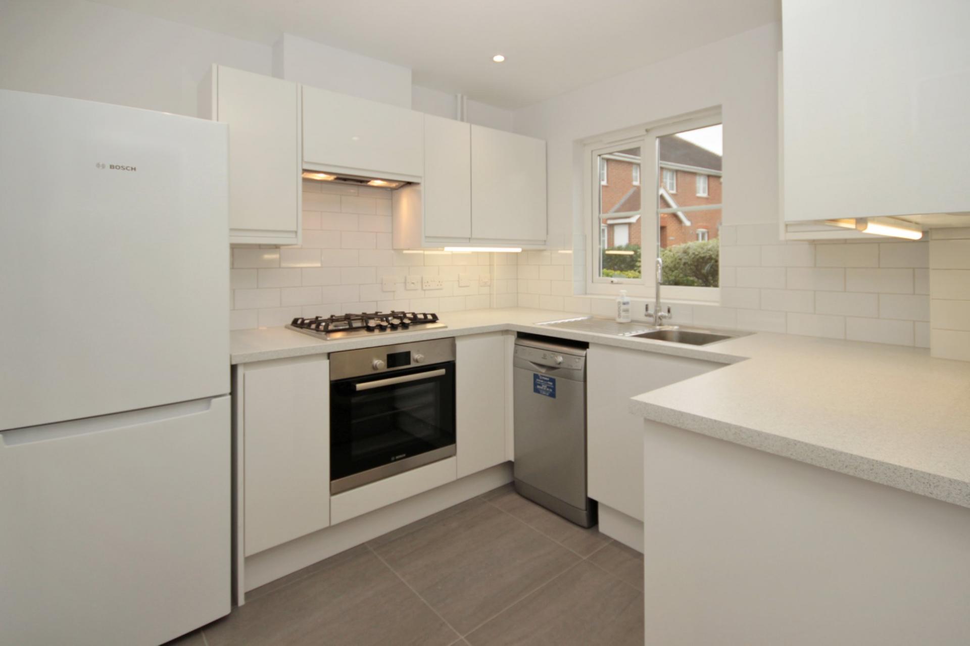 Modern semi-detached house in private cul-de-sac development. Two bedrooms each with built-in wardrobes, fitted kitchen with Bosch appliances, bathroom with shower, cloakroom/wc, private garden and garage to the rear. Professional, non-smoker tenants only need apply.